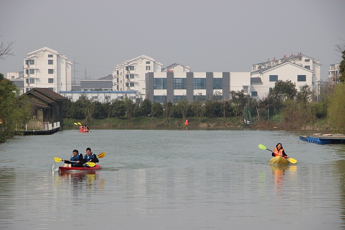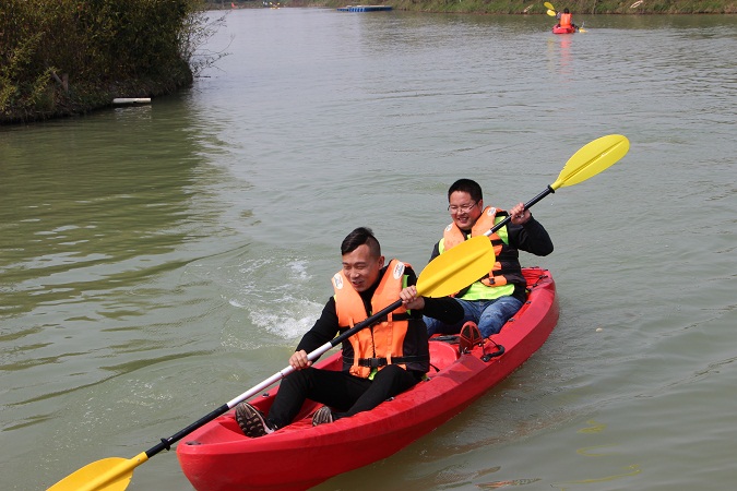 接下来的挑战项目是皮划艇接力。在团队竞技的同时,置身于美丽的景色中,感受着怡人的春光。
