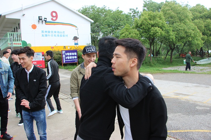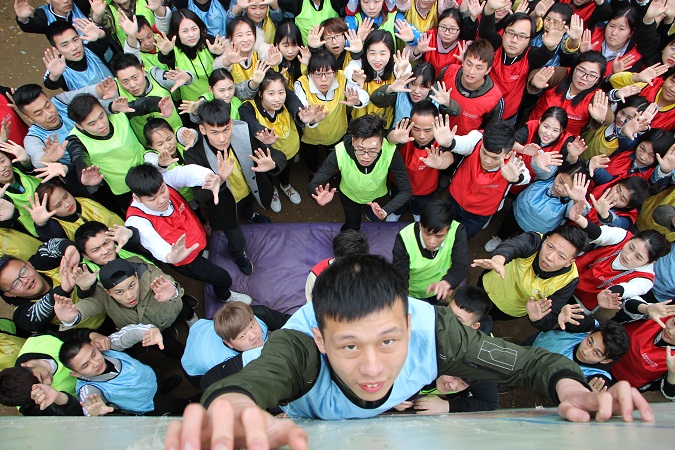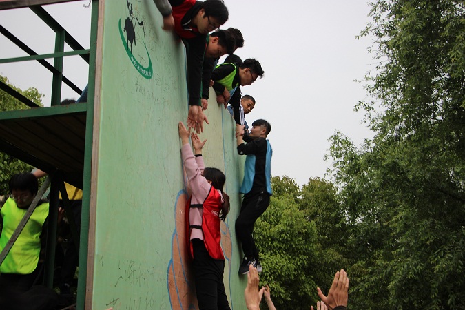 今天最后一个项目就是我们的毕业墙挑战了,在这里没有其他小队,只有一个整体——就是我们万众队。全体成员需要徒手通过一座4.2米的高墙,没有工具,只能借助我们自己的身体。底座的伙伴给予我们支撑,上面的伙伴拉我们前行,所有的伙伴给予我们保护,我们自身奋勇一跃,这就是我们的团队。