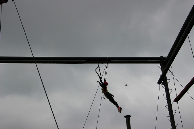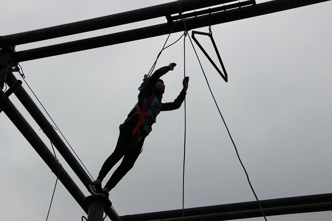 高空抓杠这个项目要求每位伙伴站在8米高的圆盘上奋勇跳跃,抓住前面1.5米的横杆。人们总是渴望安逸,当面对困境的时候,能不能鼓起勇气奋勇一跃呢。高空一小步,人生一大步,如果自己都能战胜,还有什么不能战胜的吗?