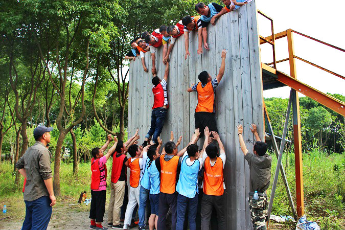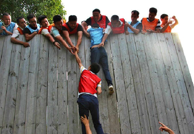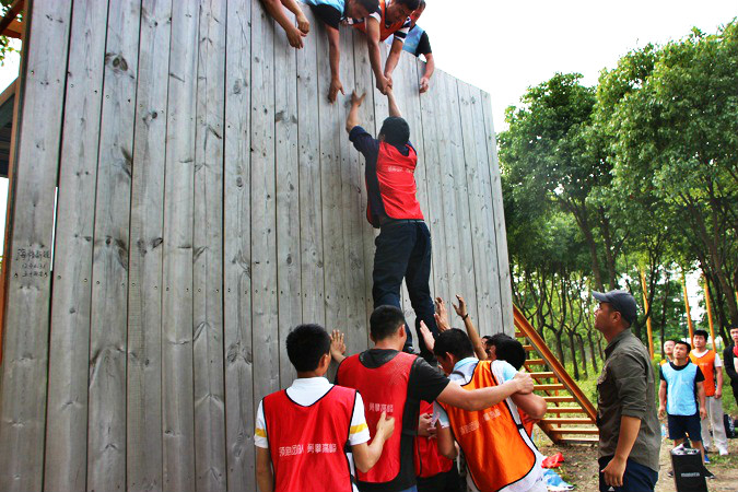 最后一个挑战是集体翻越一座4.2米的高墙,也叫毕业墙。很艰难,也充满了挑战。翻越这座墙也就像我们团队奋斗的缩影。在一个团队里,总有些人充当着我们的垫脚石,他们默默无闻,即使身上被踩满了血痕,却还是义无反顾的把我们向上举,我们甚至还来不及看清他们的长相;也要感谢我们上面的伙伴,在我们最无助、最危险的时候,拉了我们一把;更加要感激我们自己,只有自己的向上奋斗的决心和勇气,才能让我们能站在成功的高台上。