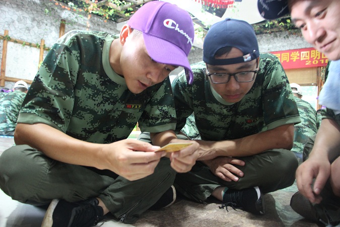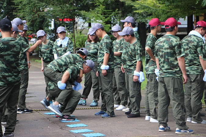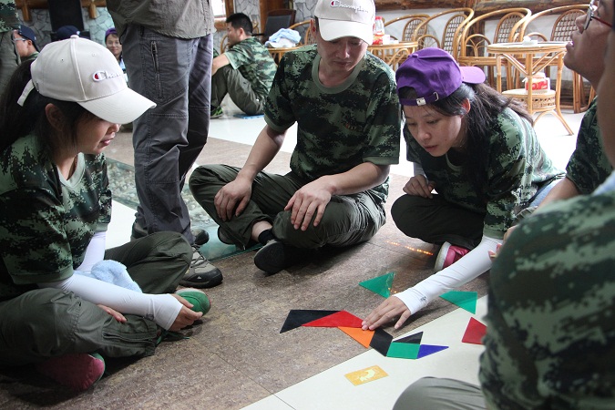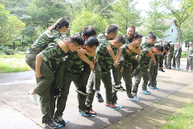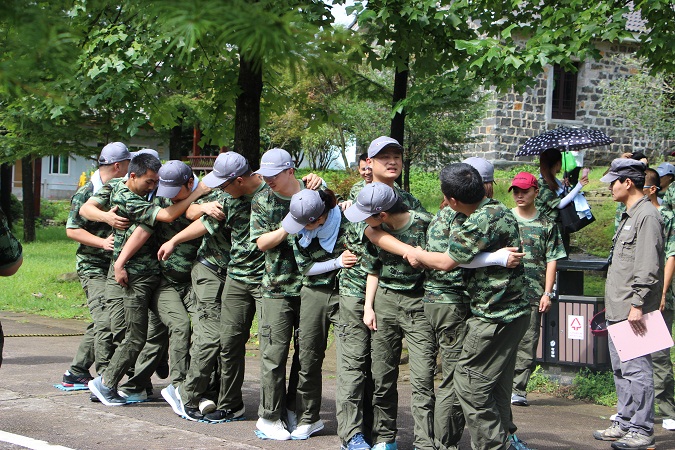 接下来挑战的项目是抢滩登陆,我们所有小组需要全员通过一条危险的河流,但是我们的工具只有6块泡沫板。这就需要我们发挥集体的智慧来想出通过的方法。不抛弃、不放弃,整个小队紧密团结,才能成功到达河流的彼岸。