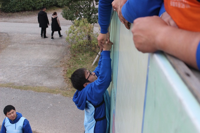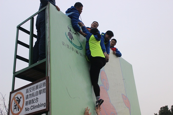 最后一个挑战是集体翻越一座4.2米的高墙,也叫毕业墙。很艰难,也充满了挑战。翻越这座墙也就像我们团队奋斗的缩影。在一个团队里,总有些人充当着我们的垫脚石,他们默默无闻,即使身上被踩满了血痕,却还是义无反顾的把我们向上举,我们甚至还来不及看清他们的长相;也要感谢我们上面的伙伴,在我们最无助、最危险的时候,拉了我们一把;更加要感激我们自己,只有自己的向上奋斗的决心和勇气,才能让我们能站在成功的高台上。